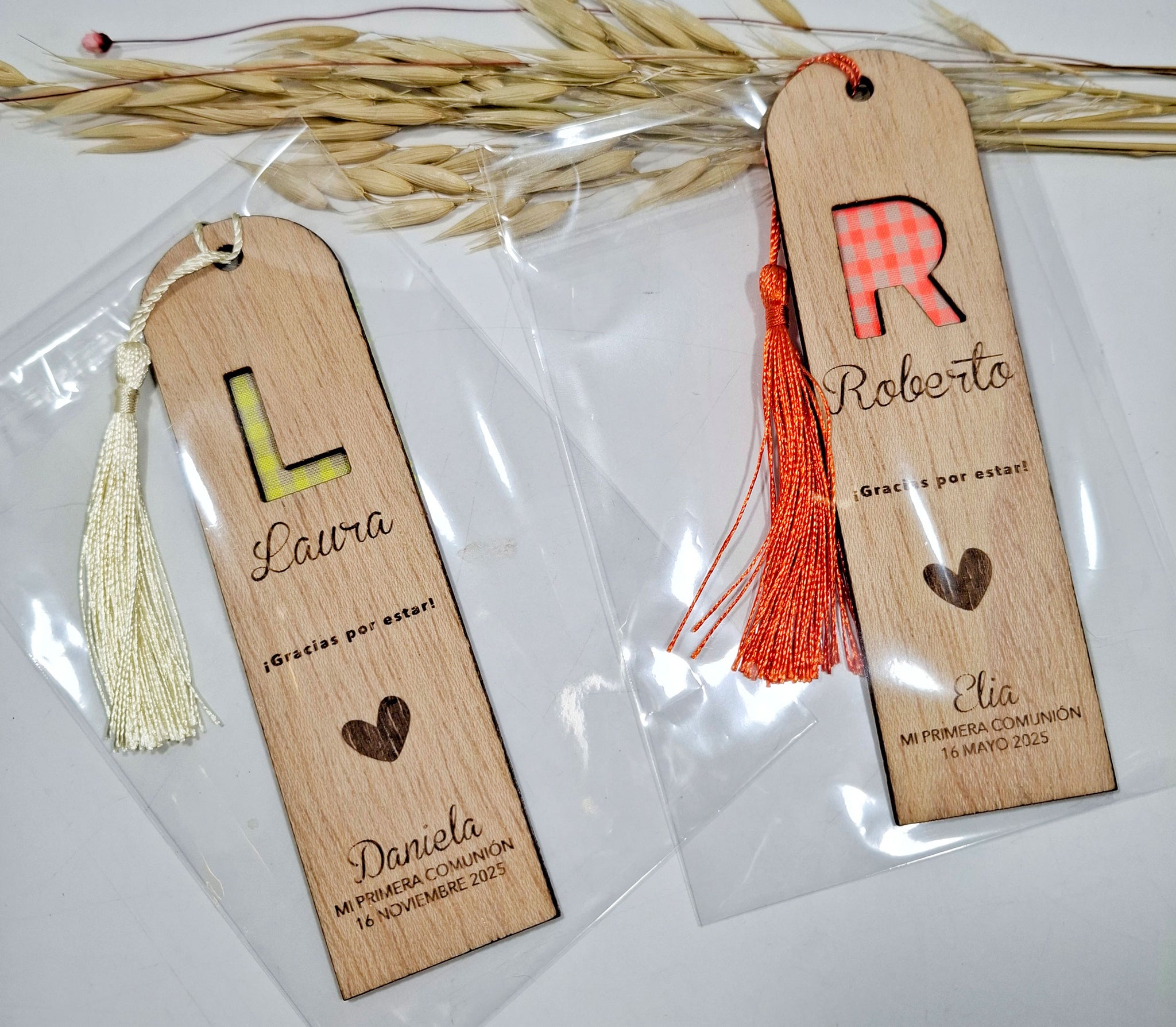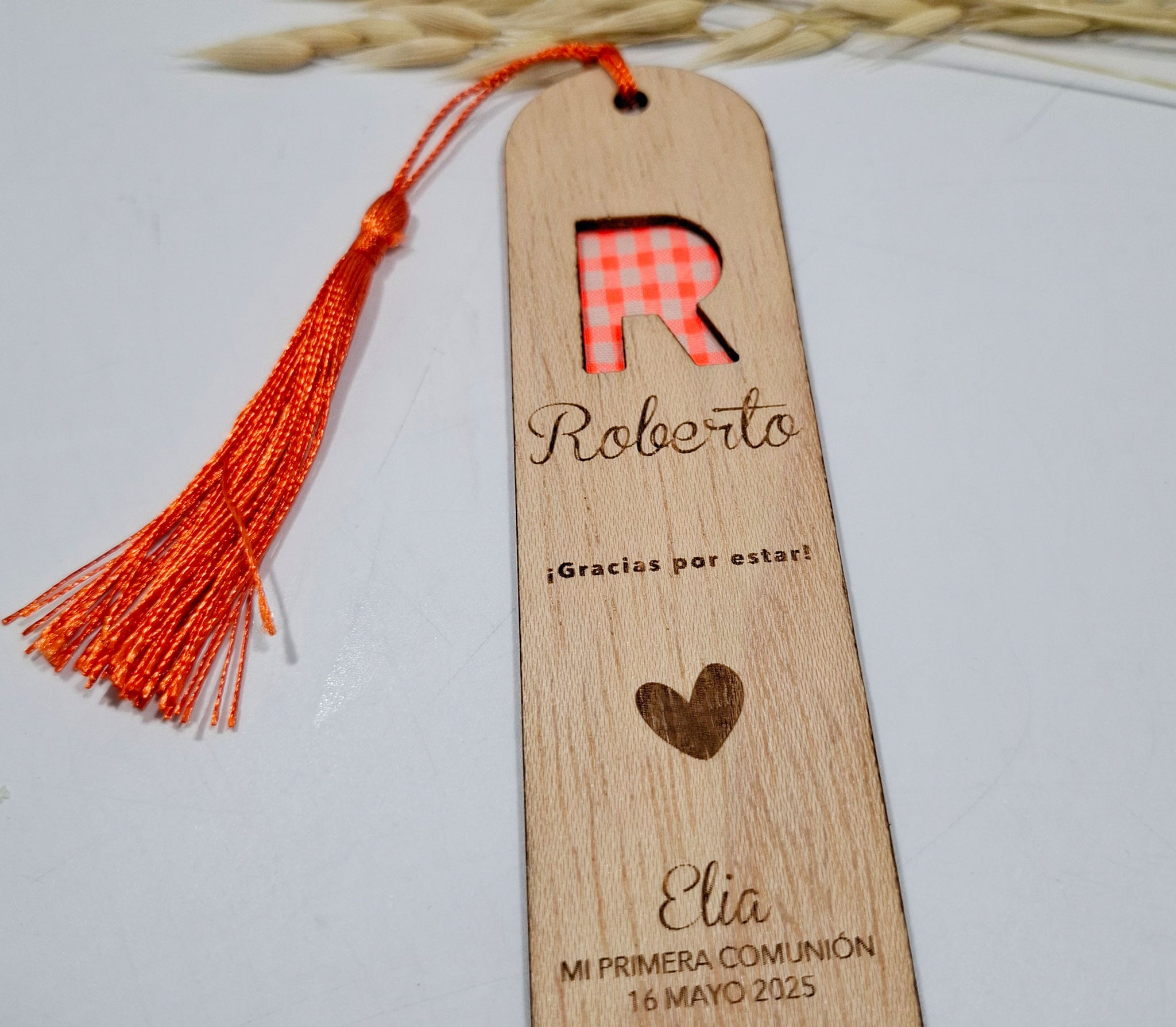 Marcapáginas realizado en madera contrachapada. Inicial troquelada y forrada con tela. Pompón flecos a juego con la tela seleccionada.