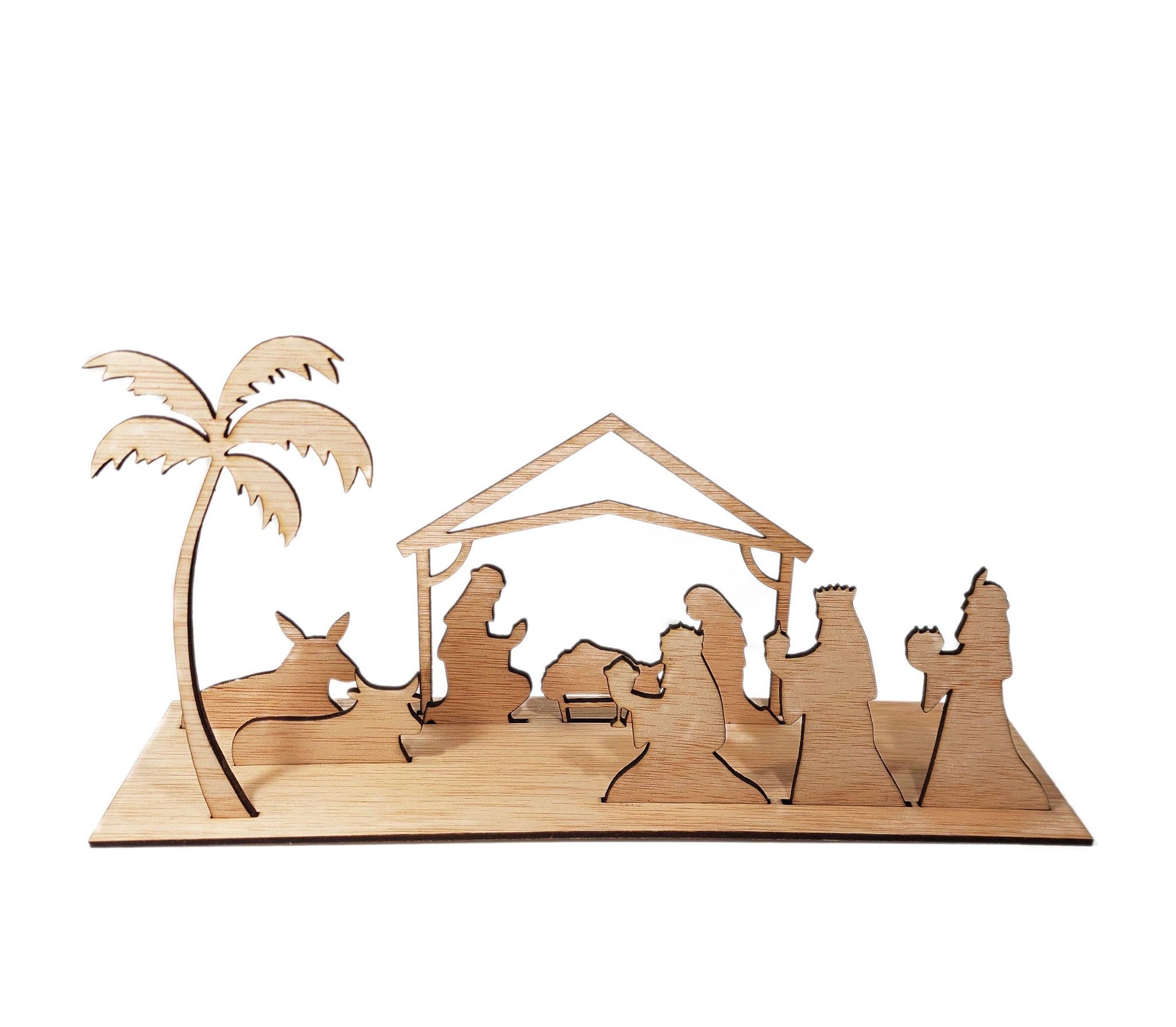 Conjunto de figuras elaboradas en madera contrachapada color natural sobre base en madera natural contrachapada. Incluye pequeño kit de luces led a pilas para iluminarlo.